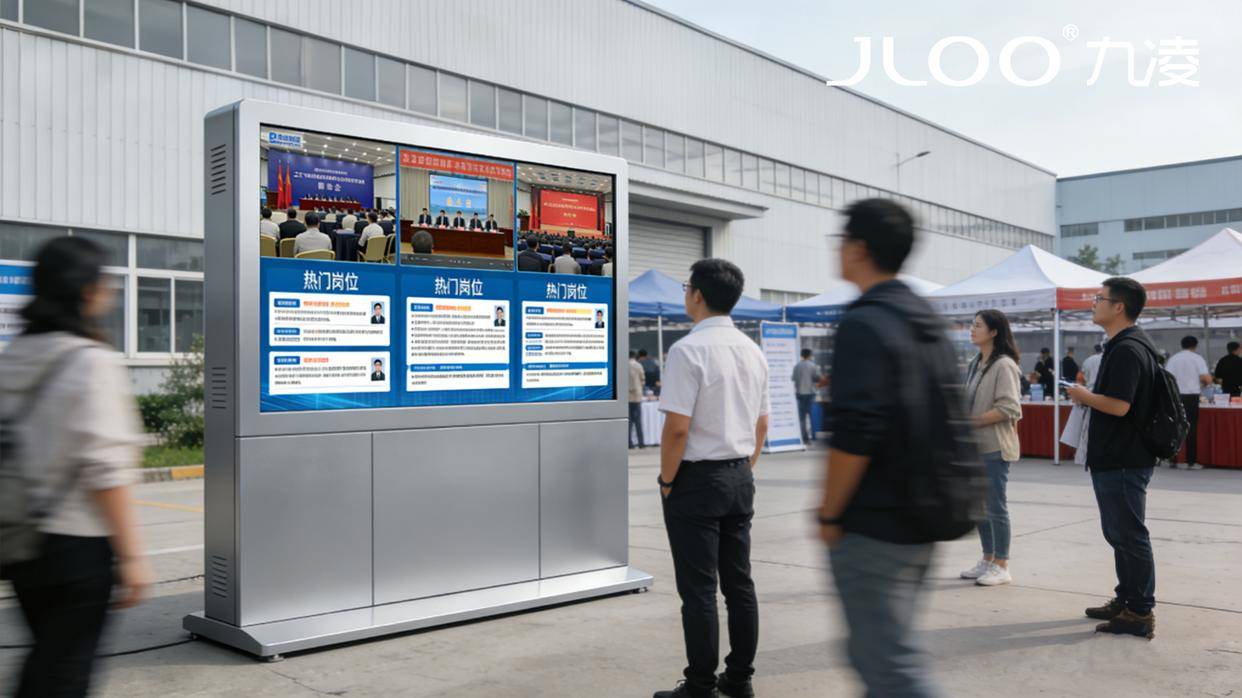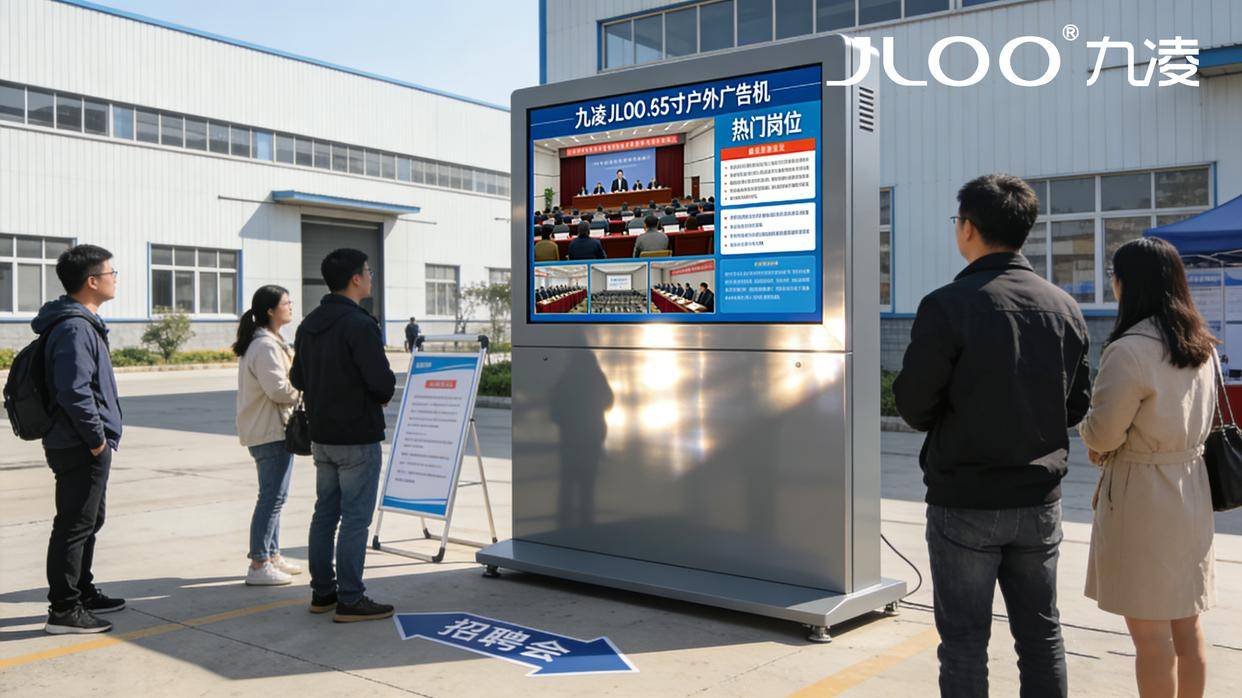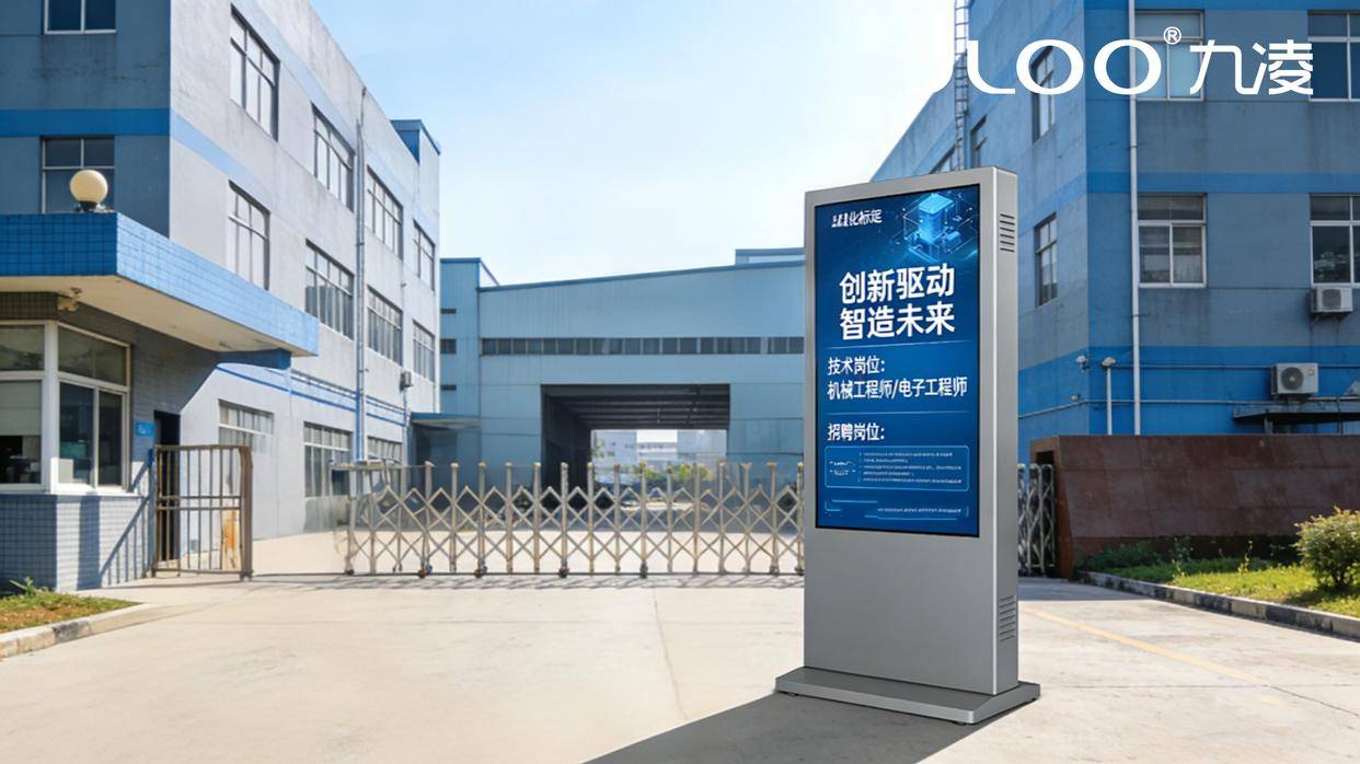 在产业升级与智能制造并行的今天,工厂园区不仅是生产制造的核心阵地,更是企业文化落地、人才集聚的重要载体。如何打破传统信息传递的局限,让企业文化深入人心、招聘信息精准触达,成为园区运营与企业发展的关键课题。九凌JLOO深耕户外商显领域十余载,以军工级品质立足市场,其85寸户外广告机凭借超大视野、硬核性能与智能交互优势,精准适配工厂园区场景,成为企业文化传播与招聘信息展示的优选载体,为园区注入全新的数字化活力,实现“文化传声”与“人才引流”的双重赋能。