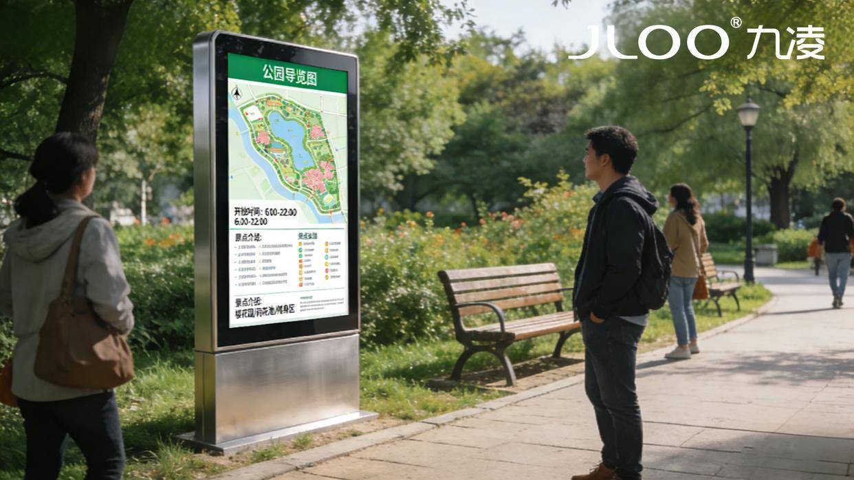 公园场景兼具开阔性与多样性,信息发布屏需兼顾视觉醒目度与空间适配性,既要让远处休憩、漫步的市民清晰获取信息,又不能破坏公园自然景观的协调性。九凌JLOO 65寸户外广告机公园信息发布屏,以65寸黄金尺寸精准适配公园入口、休闲广场、步道旁、便民服务中心等核心点位,机身采用简约大气的一体化设计,线条流畅、厚度轻薄,可灵活采用壁挂、立式两种安装方式,完美融入公园绿植、亭台等景观,实现“科技与自然共生”的视觉效果。