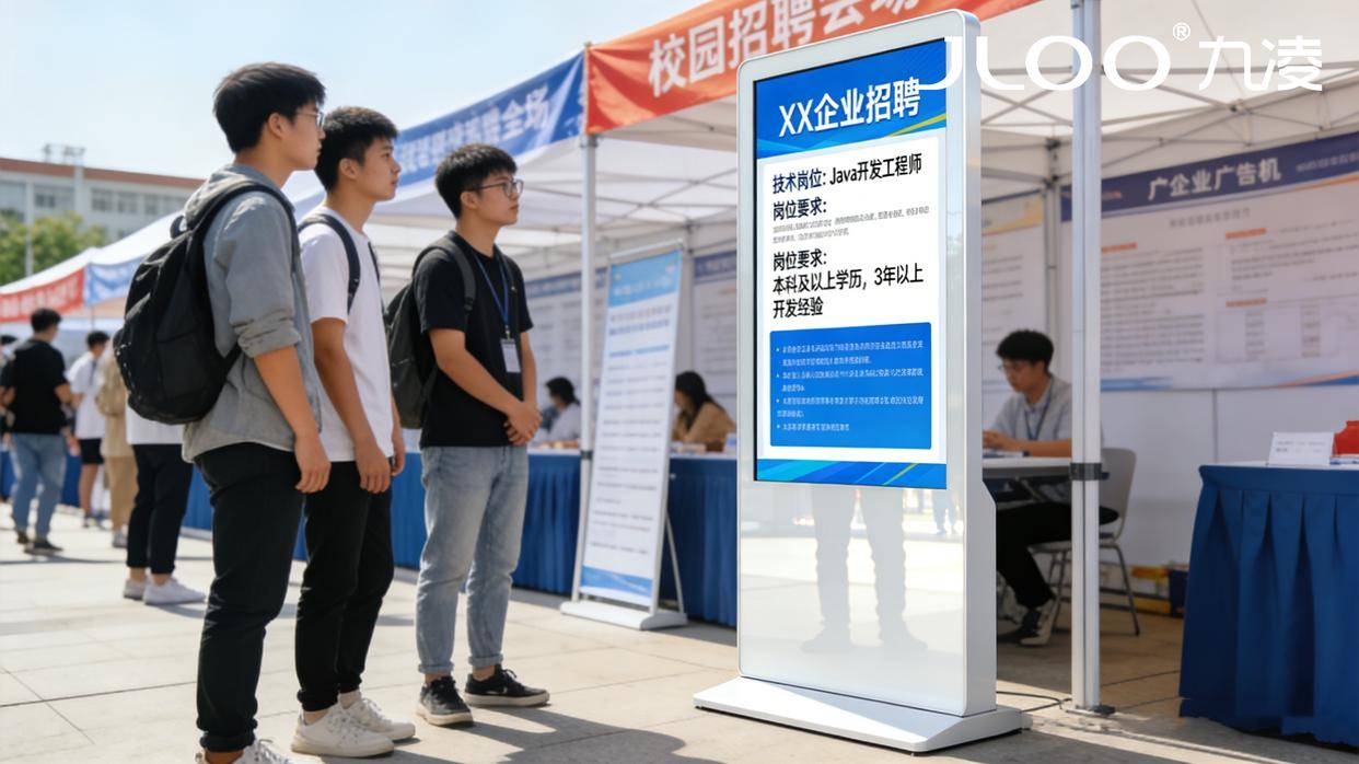 在招生宣传场景中,九凌JLOO 65寸户外广告机以“精准触达、高效转化”为核心,打破传统招生宣传形式单一、覆盖有限的局限。其4K超高清分辨率搭配1500:1高对比度,可细腻呈现院校宣传片、校园风光、优势学科介绍、师资力量展示等内容,让考生及家长直观感受院校的办学实力与校园魅力——无论是实验室的先进设备、图书馆的浓厚学风,还是校园的人文景观,都能通过高清画面立体呈现,比传统纸质海报、传单更具视觉冲击力,有效提升院校的吸引力。同时,设备支持“静态画面+滚动字幕”双引擎播放模式,静态画面展示院校形象与核心招生亮点,滚动字幕实时推送招生政策、报名时间、咨询方式、校园开放日等动态信息,受众信息完整接收率可达75%以上,远超单一展示形式,确保招生信息传递的及时性与完整性。