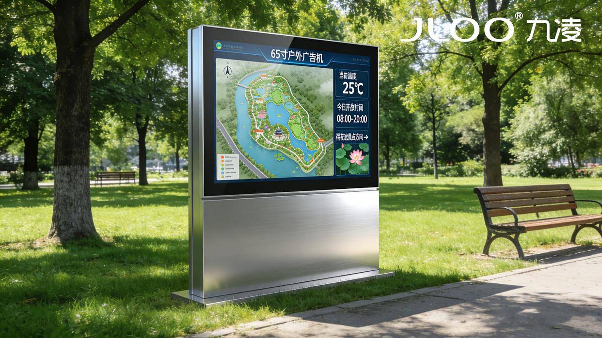 公园场景兼具开阔性与多样性,信息发布屏需兼顾视觉醒目度与空间适配性,既要让远处休憩、漫步的市民清晰获取信息,又不能破坏公园自然景观的协调性。九凌JLOO 65寸户外广告机公园信息发布屏,以65寸黄金尺寸精准适配公园入口、休闲广场、步道旁、便民服务中心等核心点位,机身采用简约大气的一体化设计,线条流畅、厚度轻薄,可灵活采用壁挂、立式两种安装方式,完美融入公园绿植、亭台等景观,实现“科技与自然共生”的视觉效果。